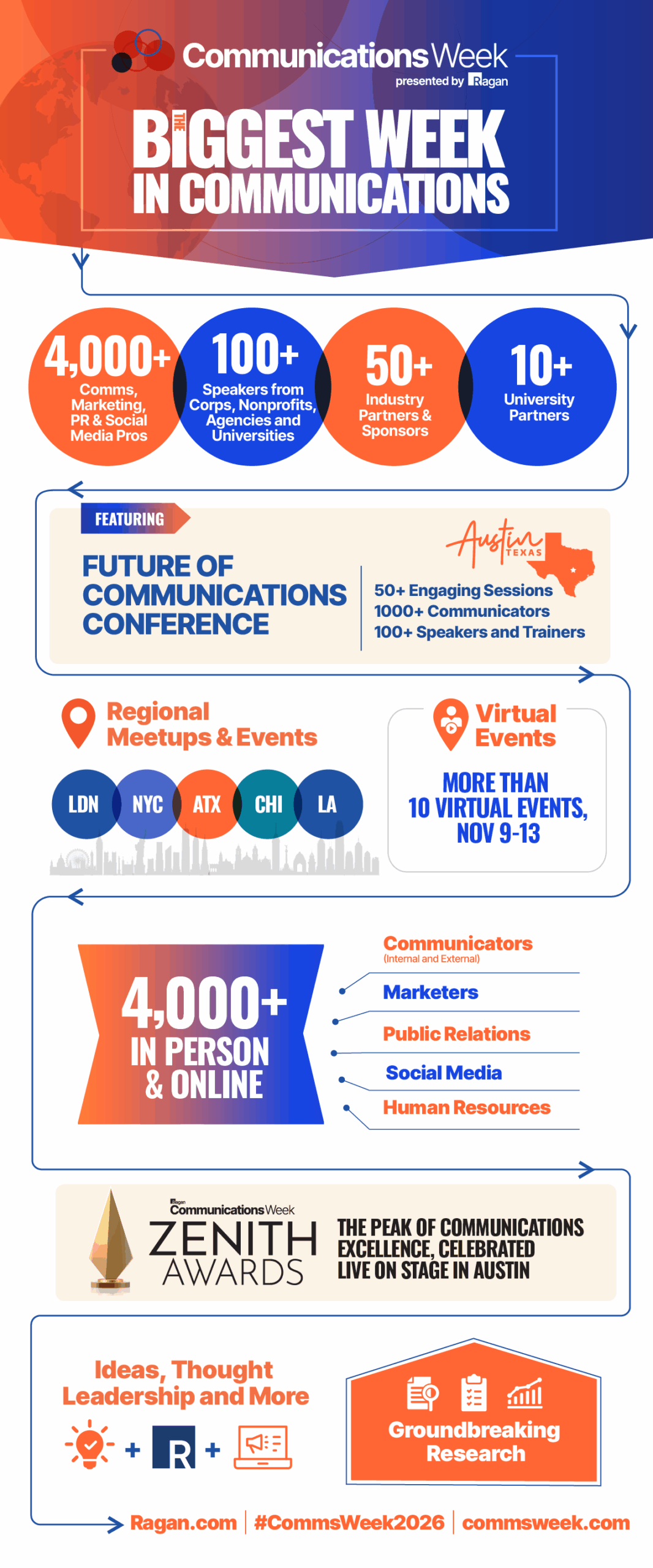 The flagship conference of CommsWeek: The Future of Communications Conference will be held November 11-13 in Austin. The event will bring together hundreds of communicators to explore key challenges and trends in internal comms, public relations, media relations, social media, generative AI and so much more.